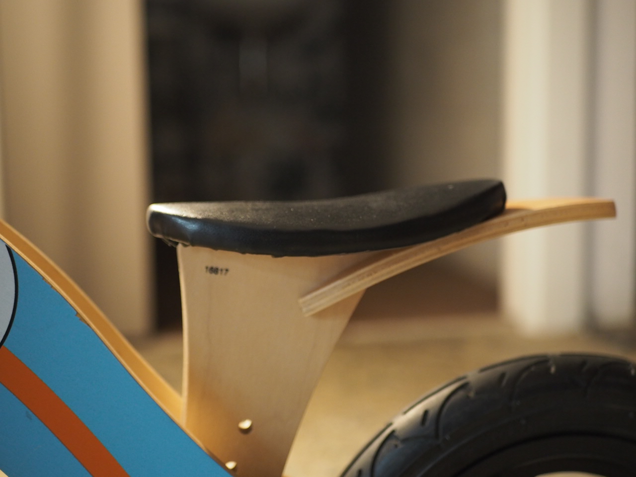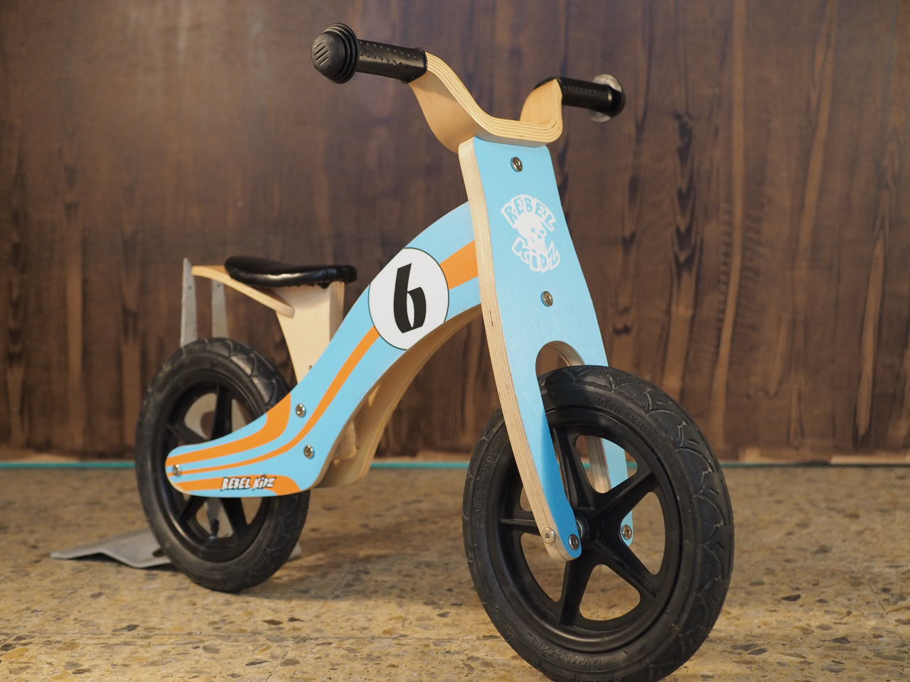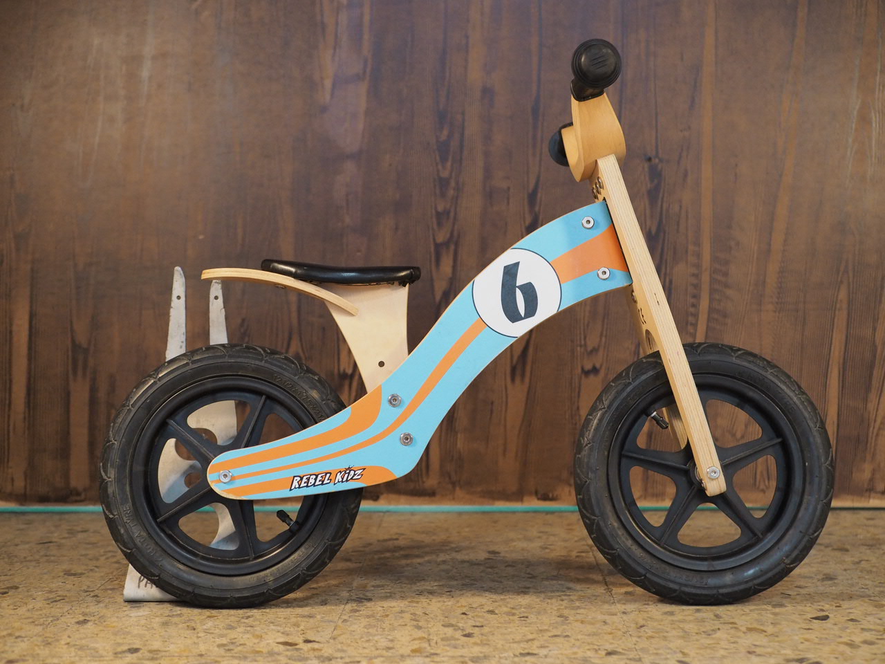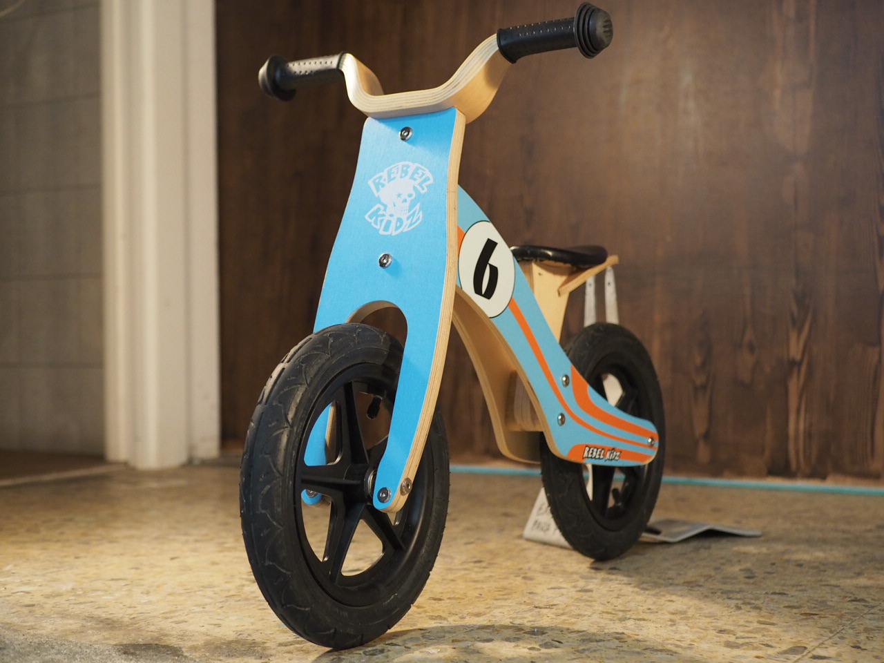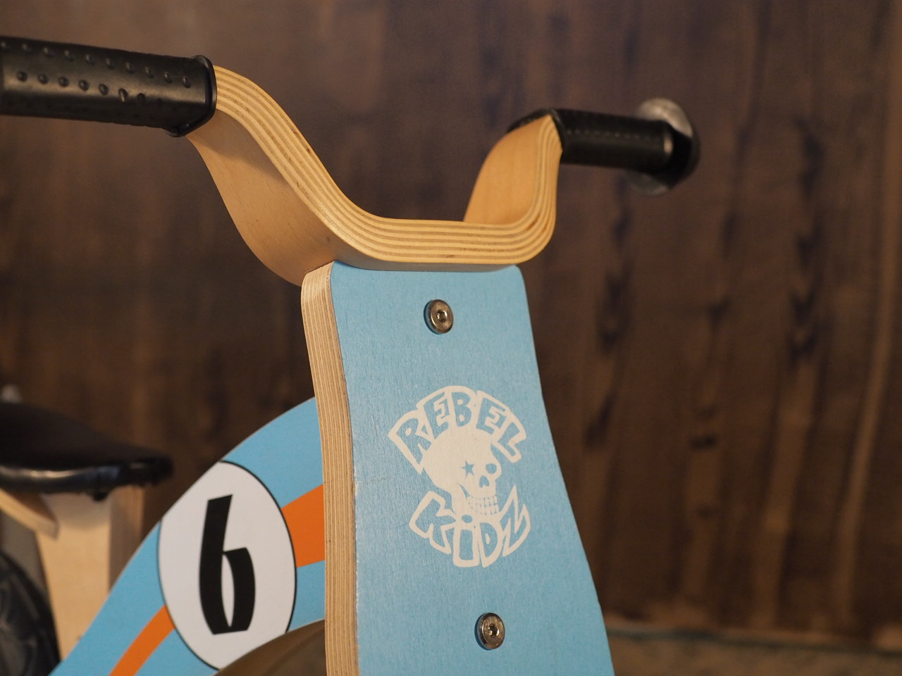 Bicicleta de aprendizaje de madera con diseño deportivo.